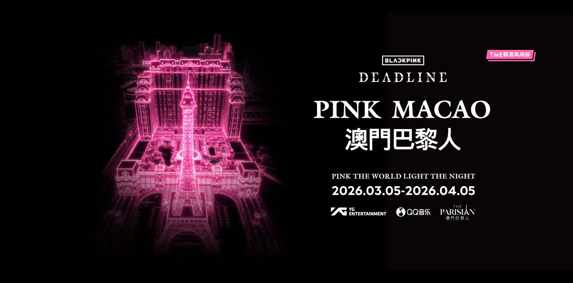 為慶祝全球現象級女團BLACKPINK開啟音樂新篇章,並致敬其震撼世界的新專輯全球發布,澳門巴黎人呈獻一場前所未有的沉浸式激光音樂匯演。這場融合尖端雷射科技與潮流音樂的視覺盛宴,將主打曲《GO》的史詩級視覺元素投射於巴黎鐵塔的外立面及週邊景觀,以光為筆,重塑《DEADLINE》音樂旋律演出緊扣專輯概念,為樂迷與旅客帶來每夜高頻次、高規格的感官衝擊。