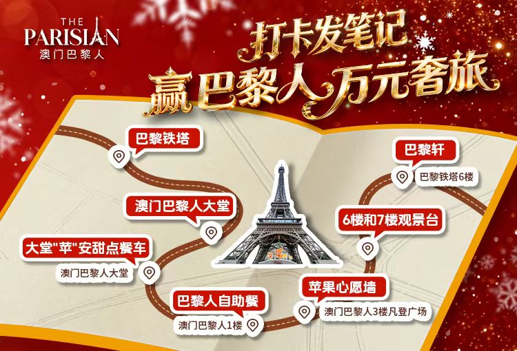 在澳門巴黎人地圖任意打卡點拍照或視頻,關注巴黎人小紅書或抖音官號,並打卡發筆記帶 #澳門巴黎人 及 #巴黎人夢幻之旅,即有機會贏取價值萬元奢旅及其他豐富獎品!